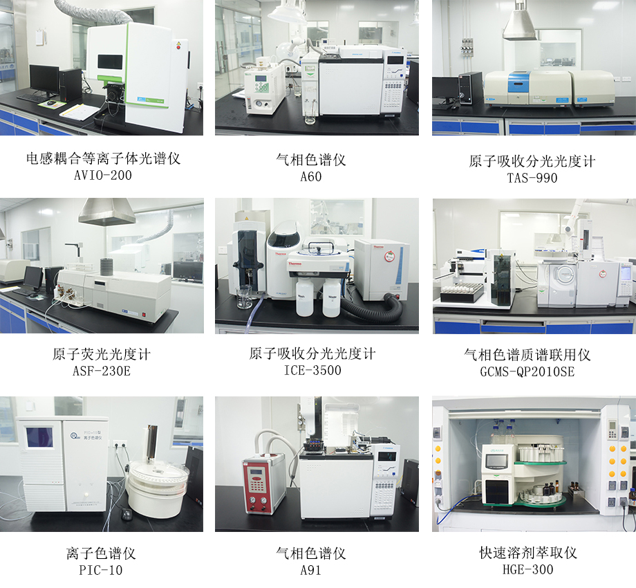 目前拥有等电感耦合等离子发射光谱仪、气相色谱仪、气相色谱质谱联用仪、原子吸收分光光度计、原子荧光光度计、离子色谱仪、十万分之一电子天平、双光束紫外可见分光光度计、万分之一电子天平、快速溶剂萃取仪、红外测油仪、pH计、溶氧仪、电导率仪、浊度仪、电子显微镜、测烟望远镜、智能高精度多路流量标准仪、全自动烟气(尘)测试仪、大气与颗粒物组合采样器(恒温)、空气智能TSP综合采样器、多功能声级计、超净工作台、生化培养箱等100多台(套)各类高精采样和分析仪器设备,并在持续增设中。其中需要检定或校准的仪器设备均经法定计量单位福建省计量检定或校准,并经过确认后实行三色标识标明其状态,设备仪器的检定使用符合资质认定的规定要求,可为检测数据的真实准确保驾护航。