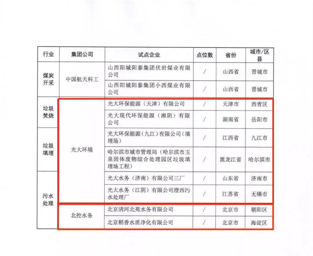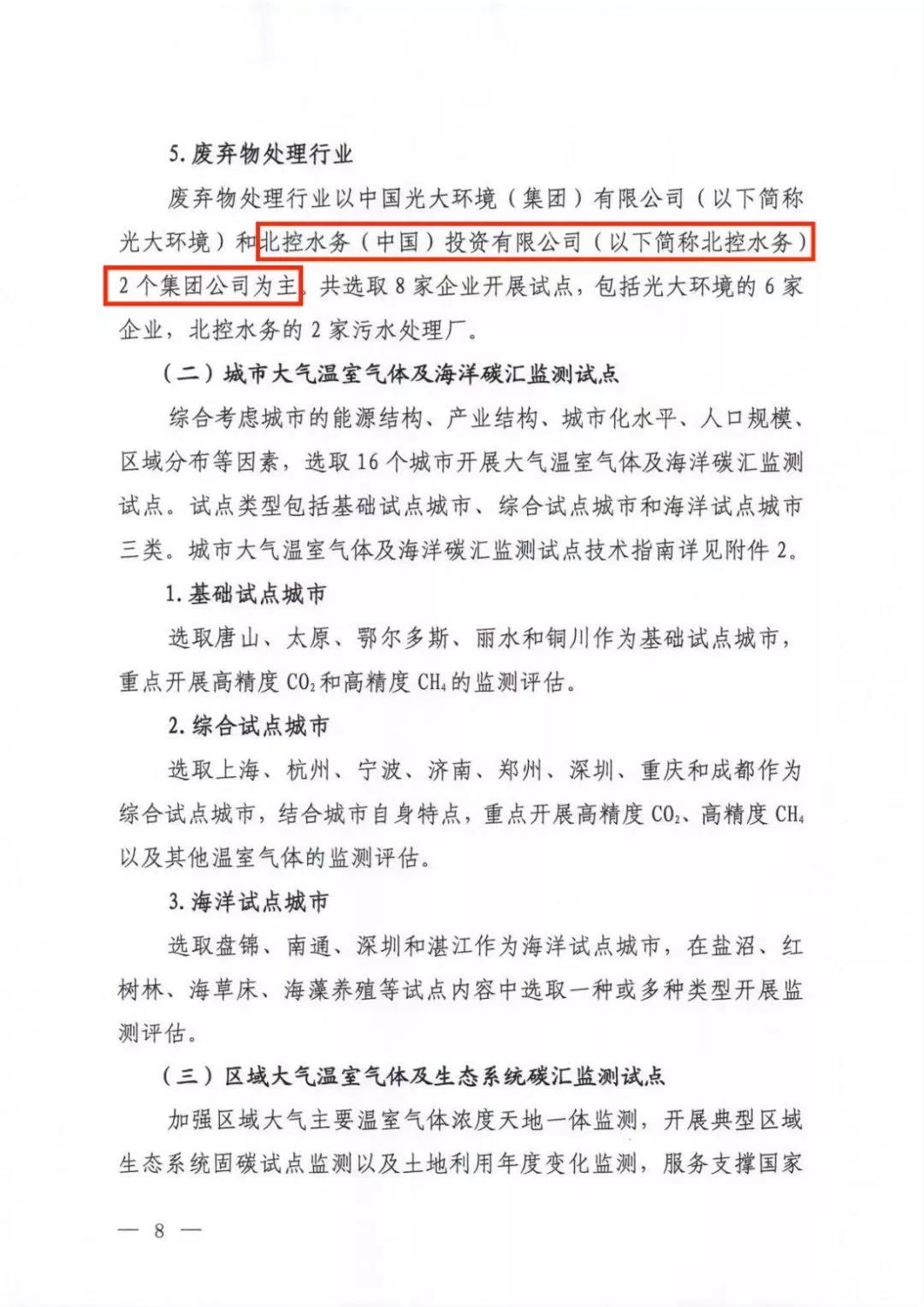为支撑减污降碳协同增效,生态环境部近日发布《碳监测评估试点工作方案》(以下简称《方案》),对碳监测评估试点工作进行部署。聚焦区域、城市和重点行业,开展碳监测评估试点,目标到2022年探索建立碳监测评估的技术方法体系,发挥示范效应。其中,第一批国家温室气体排放监测试点,涵盖火电、钢铁、石油天然气开采、煤炭开采和废弃物处理五类重点行业,北控水务下属北京清河北苑水务有限公司、北京稻香水质净化有限公司,光大环境下属光大能源环保(天津)有限公司、光大水务(济南)有限公司三厂等8家企业入选废弃物处理行业碳监测评估试点名单。