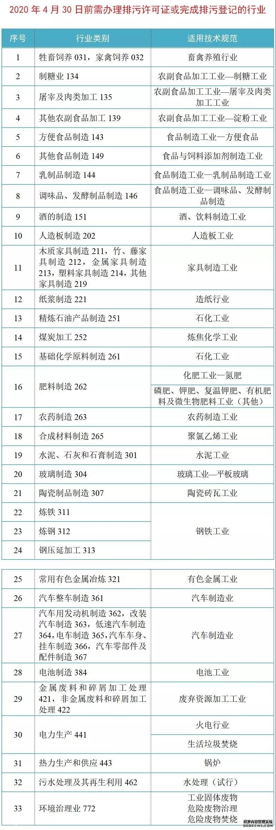 属于2017—2019年应核发排污许可证的33个行业(固定污染源清理整顿)的现有排污单位,如仍未取得排污许可证的,须于2020年4月30日前申请并取得排污许可证,或完成排污登记。需要注意的是,符合这个要求的排污单位应同时满足以下两个条件,一是所处行业在下面表中的33个行业之内,二是在2019年及之前就已经开始生产或者实际排污。