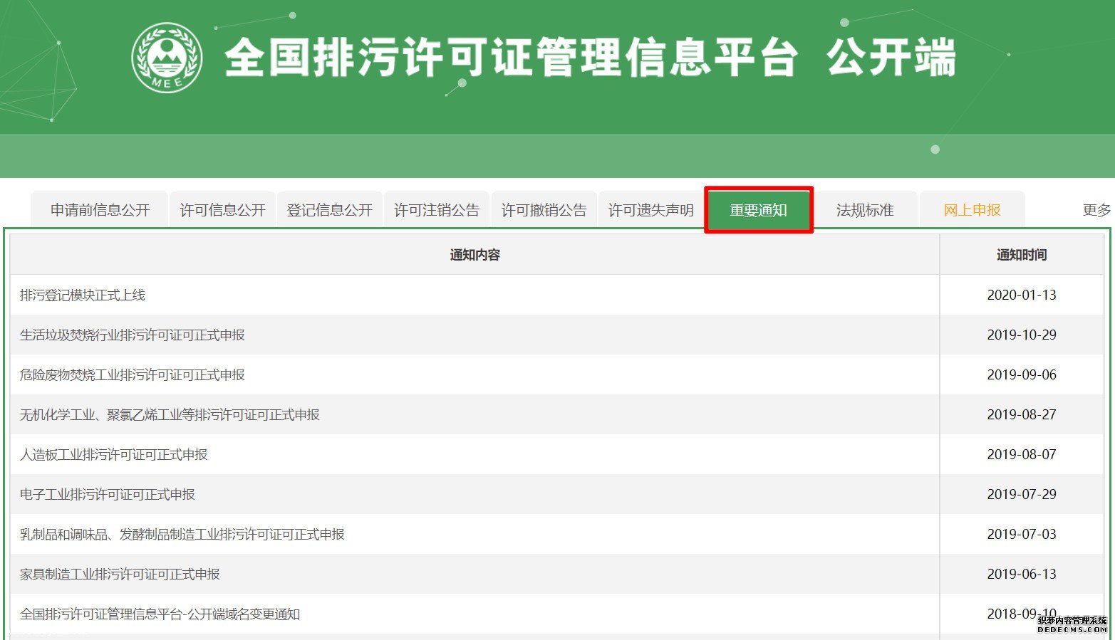 另外还可以通过全国排污许可证管理信息平台首页“重要通知”栏目查看需要申请的行业有没有正式上线,如果上线会在这里通知,着急的话,可以每天点开看一下。如果已上线,就可以去申请排污许可证。